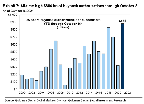 Buybacks: Through early-October 2021 we’ve seen the largest authorization of stock buybacks in history, totally nearly $1 trillion. In fact, according to the Goldman Sachs Buyback desk, expectations for 4Q are that buyback activity will amount to $3.8 billion per trading day, for a total of $230 bn over the quarter. The buyback window opens as earnings season draws to a close, so much of the activity will be concentrated in November and December. Any selling pressure will likely be supported through year-end by the corporate bid.